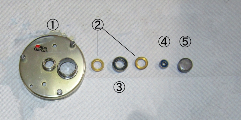 ⑤はライトスプールキャップですが、写真に写っていないベースワッシャが内部に2枚入っています。全てパーツクリーナで洗浄します。