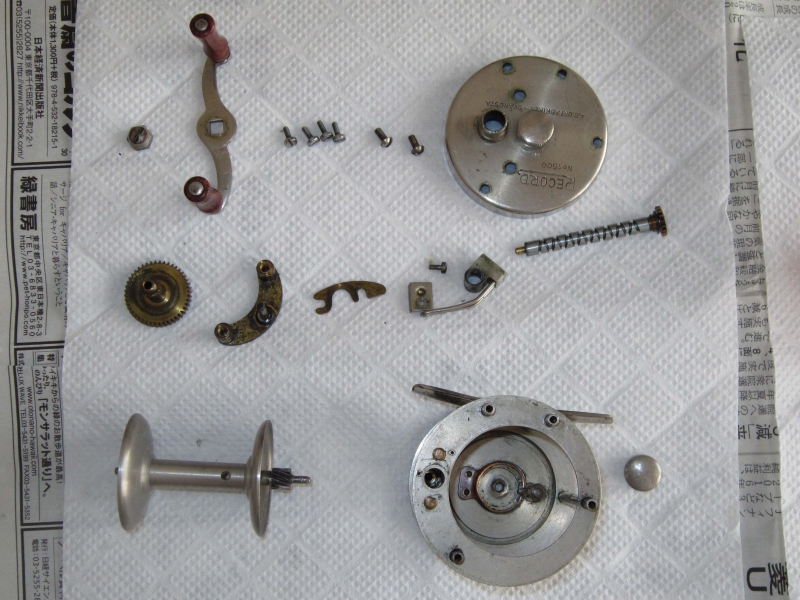 今回はRecord1500のメカニズムを詳細に知るために分解してみました。写真に分解した全パーツを示します。すでにお話しましたが、7000シリーズのパーツ数は60点余りあります。それと比較すると、このリールはパーツが非常に少ないことがわかります。この後組み立てながら、一点一点解説していくことにします。組み立てにおいては、パーツをクリーニングした後グリスアップしていきましたが、製造後長い年月が経過している関係上汚れが全く落ちない箇所が多くありました。写真においてはそうした汚れもRecord1500の歴史と捉えてお楽しみください。
