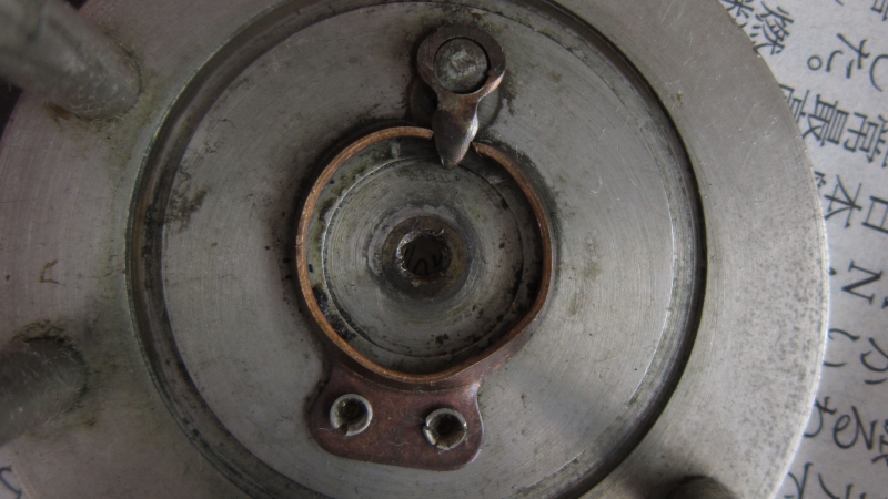 スプリングアームをよく見ると、形状が歪んでいることがわかります。工場出荷時点でこうなのか、前のオーナーが手を加えたのか定かではありませんが、クリック力を調整するために工場で形状を調整している可能性も否定できません。さらに、クリック機構の周囲に溝があります。これはスプールのエッジがここに入り込むことで、ラインの巻き込みを防止しています。また、軸受けは左サイドプレートにカシメられており、分解することができません。