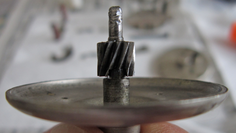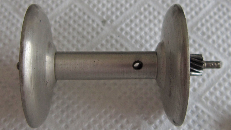 右サイド(ピニオンギヤ)スプールの右サイドにはピニオンギヤがあります。歯が角度を持ったはす歯ギヤを使っています。歯数は12。シャフトの先端が傷んでいますが、おそらく前のオーナーが手を加えたものと思われます。シャフトとギヤはキー溝を切って圧入で固定されています。