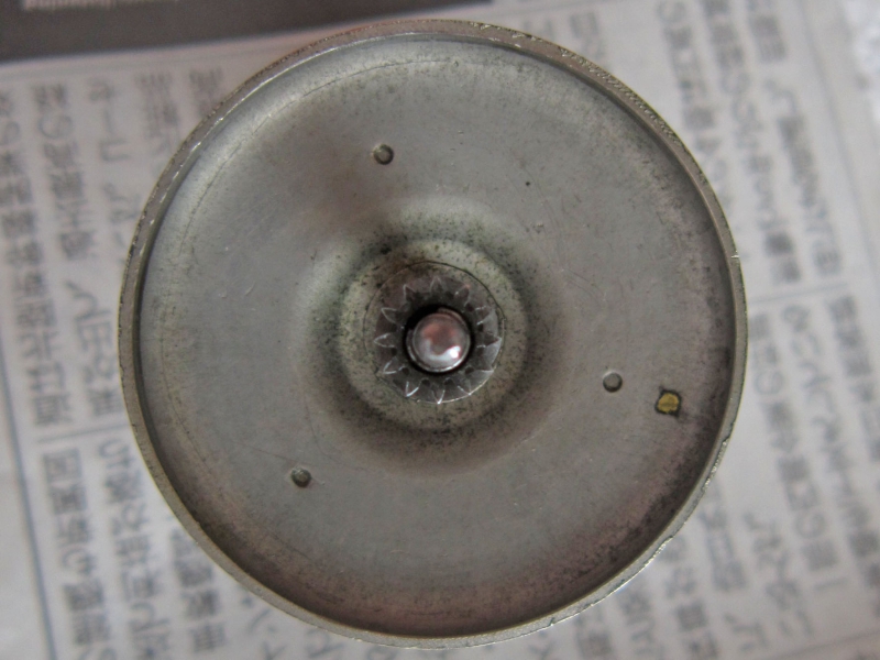 スプールは芯と左右のツバの3部品を一体にカシメて作られています。さらにシャフトを通して、スプールの芯に穴を開け、スプリングピンを打ち込んで固定しています。現代のリールはスプールは一部品で作られていますが、当時は製造技術が未発達だったのかもしれません。スプールがどうやって作られているかについては、左サイドの写真から知ることができます。スプールの表面状態から、アルミダイキャストであることがわかります。