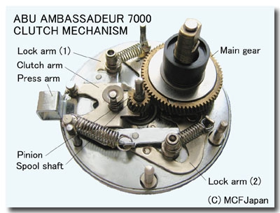| メカニズム | パーツ数から見る7000シリーズ|7000ドライブシステム概説|ドラグ調整|ハンドル逆回転防止|スプールフリー|アンバサダーのギヤ|ブレーキの仕組み|クリック|レベルワインド|自動二段変速ギヤ |