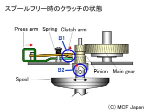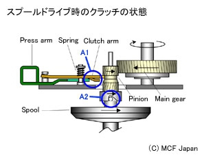 プレスアームはイラストの左右方向にスライド可能です。先端部分はクラッチアームのスロープが付いた部分に接するように配置されています(青丸A1)。クラッチアームは、左はピンに連結され、右はピニオンの溝にはめ込まれています。左のピンを支点に右のピニオン側がスプールシャフトに沿って上下することができます。クラッチアームの中間にはスプリングがあり、これによってクラッチアームは常に下側に押し付けられた状態、つまりピニオンがスプールと連結した状態(青丸A2)になります。