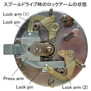 プレスアームが押し込まれるとロックアームの先端はロックピンからはずれて内側に閉じ、蟹の腕がロックピンを抱え込んだ状態になります。ロックアームは内側のアール部分がスプリングを掛けているピンに当たって止まります。これが当たる時にカチッと音がしていたわけです。プレスアームはスプリングによって常に左側に戻ろうとする力がかかっていて、ロックピンを抱え込んだロックアームとバランスしてロックします。