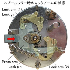 プレスアームが押されていないときは、ロックアームの先端がロックピンに接しています。ロックアームは、それぞれのスプリングによって常に内側に閉じようとしています。ロックアームの回転軸は十字線で示したカシメになります。