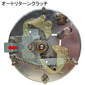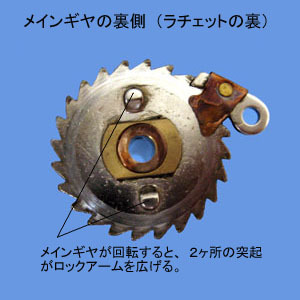 最後に、ロックを解除するオートリターンクラッチ機構について説明します。メインギヤの裏側にラチェットがあります。さらによく見ると、ラチェットには2ヶ所突起が付いています。この突起がロックを解除する働きをします。