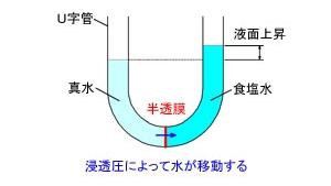 よく教科書などに登場するU字管の中央を半透膜(中央の赤い線)で仕切ります。半透膜とはある一定の大きさ以下の分子やイオンを透過し、大きな分子やイオンは透過しない膜をいいます。つまり分子レベルの大きさのフィルターだと思えばわかりやすいですね。半透膜を境に左側に真水、右側に食塩水を入れると、やがて右側の食塩水のほうが液面が高くなります。この液面の高さの差に相当する真水の重さが浸透圧です。実験で用いる半透膜はセロハンが挙げられます。