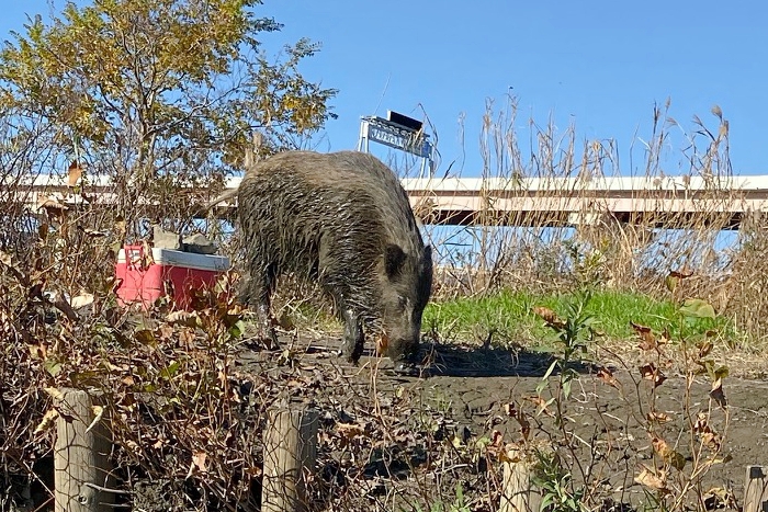 今日の荒川はポカポカ陽気で風も無く潮周りも緩やかで静かな日でした。案の定、当たりも遠くスマホを見ていました。ガサガサと音がしましたので顔をあげると何と目の前にイノシシが!デカイ、ビビりました。