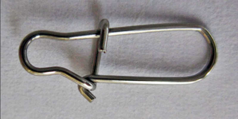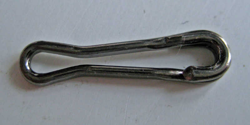 錘の連結に使っています。本来はルアー用で、小型軽量、1.5号で28ポンドの強度。錘に使ったのは、無理な負荷がかかった時に変形して錘が外れること、タモに引っかかりにくいことが理由です。小さくて強いスナップのため、慣れないと扱いにくいのが難点です。