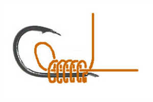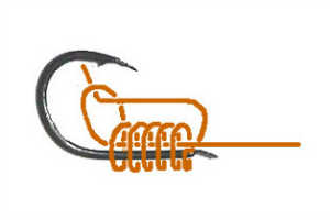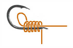 ハリの軸のまわりに5から7回程度糸を巻きます。巨鯉ハリス8号を使う場合は5回程度、またナイロンハリス5号(ゴカイ釣り用)の場合は7回程度巻くようにしています 。実際に巻くときは図のように糸の隙間をあけて巻くのではなく、糸に軽くテンションをかけながらハリの軸にしっかりと隙間なく巻き付けます。