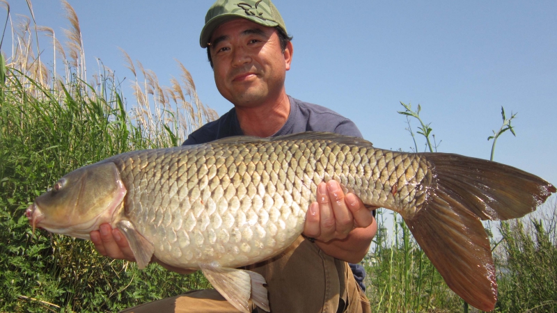 しかし今回のオフ会唯一の当たりとあって、是が非でも上げて欲しいという思いは皆一緒です。岸に近い乱杭だけに、諦めずにラインを軽く張って鯉が抜け出してくれることを待ちます。しばらく待つとすっと抜け出してやりとりを開始。いつものようにこぶちゃんがネット係で無事ランディングすることができました。レギュラーサイズながら、尻尾が大きく発達した綺麗な鯉でした。これで参加者一同胸を撫で下ろしました。