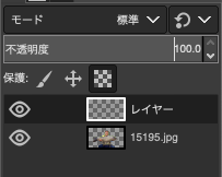レイヤー/新しいレイヤーの追加/OKをクリックします。このとき画面右のレイヤー表示において追加したレイヤーが写真のように市松模様になっている場合は、レイヤー/透明部分/アルファチャンネルの削除をクリックします。