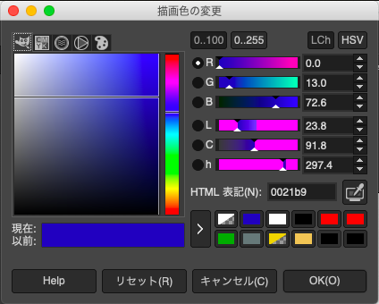 次に背景の色を塗ります。画面左の前景・背景マークの左上の四角(前景)をクリックすると、描画色の変更ウィンドウが表示されます。ここではブルーを選んでOKをクリックします。