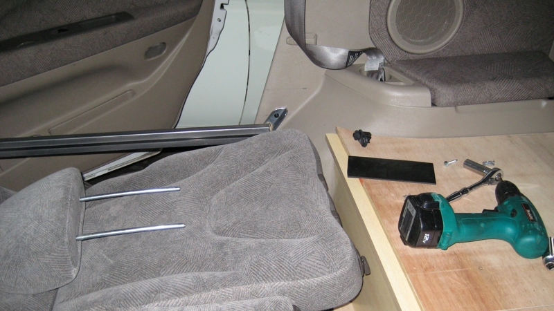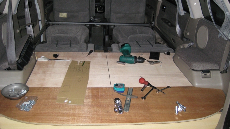 カーゴスペースのベッドの底板、兼収納蓋を、車の曲線に沿って作ります。なんとなく出来上がりのイメージが湧いてくる状態になりました。続いて、セカンドシートスペースにベッドの基礎構造を作りますが、今回の改造の最大の難関ともいえる工程です。福田さんと何度も相談した結果、セカンドシート周りに着脱可能な鉄フレームを取り付け、その上にベッドを置く構造に決めました。また、セカンドシートの間にセンターコンソールを作り、普段は小物入れとして使用し、ベッドを設置するときは周辺の鉄フレームとともに、真中でベッドの荷重を支えるようにします。福田さんを悩ませたのは、着脱可能な鉄フレームをどうやって支えるかでした。