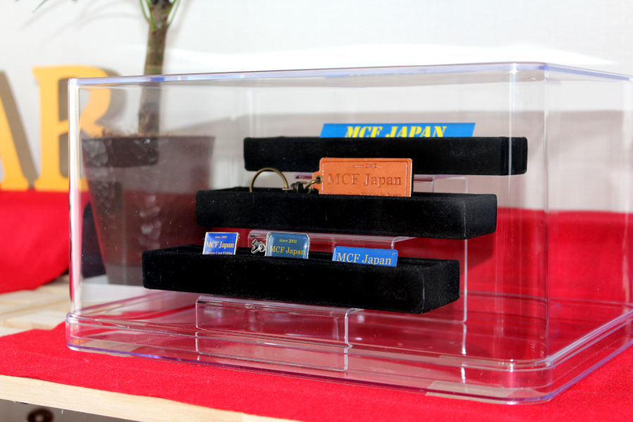フックと同じ方法でMCFオリジナルグッズをディスプレイしてみました。上から順に、スリムステッカー2、キーホルダー、ピンバッジ、ストラップ、ドームシールです。それぞれの詳細はオリジナルグッズのページをご覧ください。