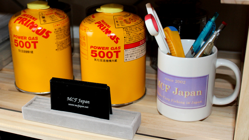 手前の黒いのが二つ折りのMCF携帯ミラーで、右がMCFマグカップです。マグカップは製作直後は鮮やかなブルーだったのですが、長年にわたり食洗機に入れた結果このように色褪せてしまいました。2020年まで釣り場で使用していましたが、ラボ開設を機にペンスタンドとして使い始めました。