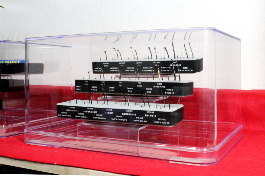 フックのコレクションはラボの右岸の棚最上段に置いていますが、椅子に座った時に目の高さになるように棚を選びました。心ゆくまでのんびりと眺めることができます。