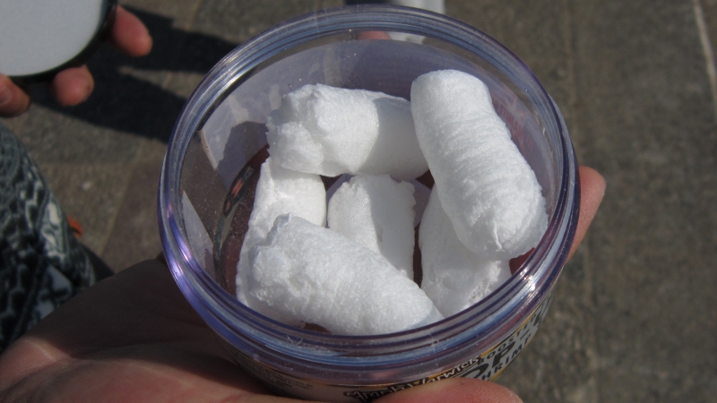 ユーロカープのリグフォームです。水溶性の発泡材で、仕掛けの絡み防止に役立ちます。使い方はハリスをこのフォームに通すか、ふたつに折り曲げてハリスを挟み、少し濡らしてフォーム同士をくっつけて固定します。ハリの直上に付けた状態でキャストします。