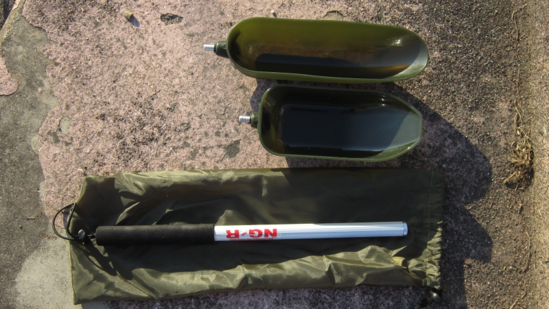 NG-CARPのベイトスプーンです。ロング、ノーマル2種類のスプーンと40cmのスティック1本がセットになっています。スティックの長さからわかるように、比較的近めにフィーディングするのに向いています。写真のような収納袋付きです。
