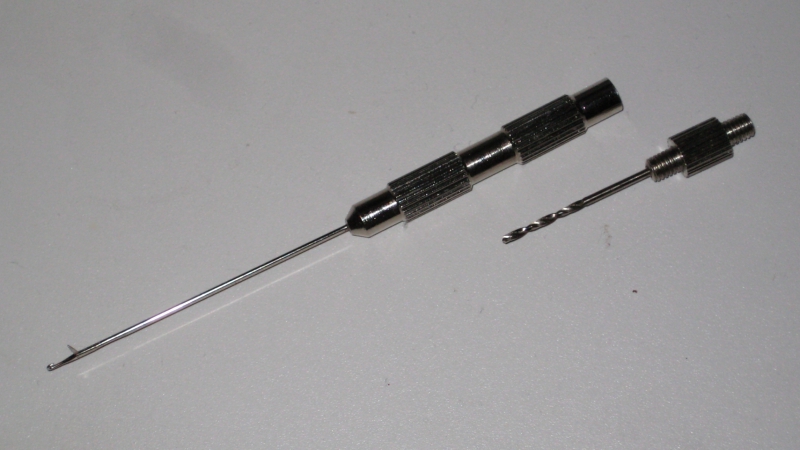 ニードルの取っ手部分にドリル(写真右側)が収納されています。ドリルは使用するときに逆向きにネジ取付します。こぶちゃんがオークションでセット購入し、その内の一本を分けていただきました。