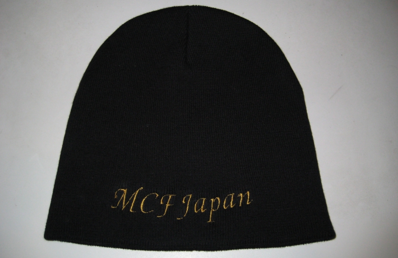 冬の鯉釣りでは必須のニットキャップです。「MCFJapan」の文字は、さりげなくするために柔らかい字体にしました。第24回オフ会で被りましたが、誰も気付かなかった?(笑)