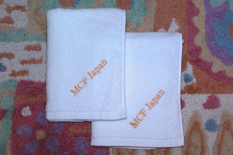白地のハンドタオルにブルーの背景色と黄色の文字をプリントしました。製造元のフリーワールドさんのご厚意で、無料でサンプル製造していただいたものです。
