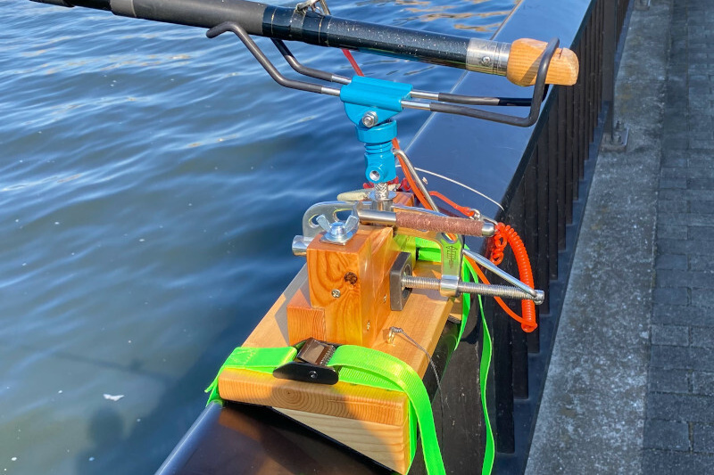 傾斜がついている手すりに第一精工の竿掛け「受太郎」をとりつけるための台座です。ベルト2本で手すりに固定するタイプですが、上面はできるだけ水平になるように台座の下に三角の板をとりつけ、その底面に柔らかいゴムを貼り付けています。受け太郎を固定する角材は、竿を出す方向によって取り付けます。この写真のは左向きに竿を出すタイプです。