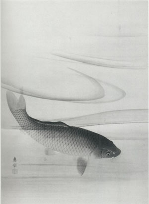 応挙作品にふさわしく、鯉の頭部、特に目の周辺に関しては実にリアルに描かれていて、絵から浮き出さんばかりの雰囲気が漂っています。さらに水の動きの描写が絶妙です。透明な水を水墨で表現するために最小限のタッチで描かれていますが、その一方で絵画の大半を占める水の部分は空白感がないどころか、むしろ優雅に泳ぎ回る鯉の自由空間の広がりを感じずにはおれません。江戸時代の鯉の水墨画の代表作に挙げられます。
