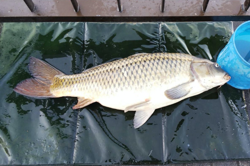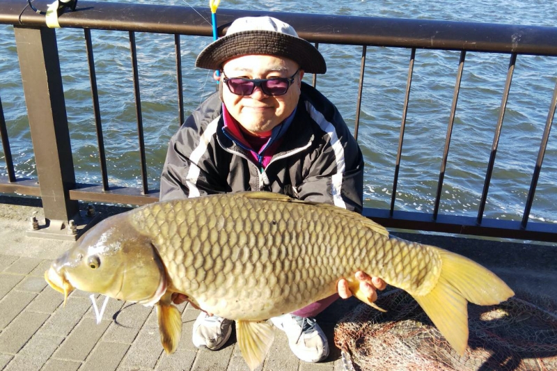 その後エルボさんに2本。「写真撮るよ」と言ったら照れくさそうにポーズ。その後、鯉のアタリはありませんでしたが、穏やか天気のもと楽しい1日でした。