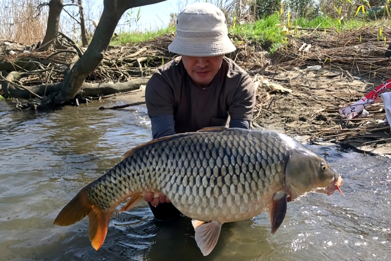 私は全く当たらず、浅場から深場に打ち替えたり、ボイリーをローテーションしたり(釣れてないからローテーションじゃないか^_^)、ペレットをフィーディングしたりと出来うる事をあれこれやりますが、苦戦⤵︎撤収予定時間の1時間前にやっとヒット😄