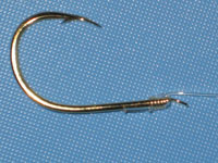 ハリの軸のまわりに5から7回程度糸を巻きます。巨鯉ハリス8号を使う場合は5回程度、またナイロンハリス5号(ゴカイ釣り用)の場合は7回程度巻くようにしています 。実際に巻くときは図のように糸の隙間をあけて巻くのではなく、糸に軽くテンションをかけながらハリの軸にしっかりと隙間なく巻き付けます。