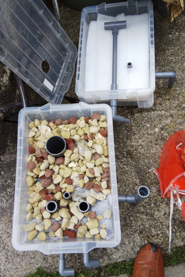ホームセンターに行き、外部濾過装置の材料を買い込んで来ました。13リットルと25リットルの2層式です。水中ポンプで水を揚げて、1層が13リットルの物理濾過層で、2層が25リットルの生物濾過層にします。オーバーフロー対策も追加します。ポンプのパワーが大きい気がするので、やっぱりつけておかないと、溢れ出したら大変な事になってしまいます。ろ材に使う防犯砂利を洗って、次の休みにセットする予定です。