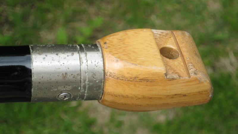 写真では見えませんが、この竿をよく見ると、ダイコーのロゴが現在の「Daikoh」ではなく、「Dykoh」となっています。次のモデルから現在のロゴになったと思います。バットの部分は現代では見られなくなった、素材シート端のスプラインやラッピングテープ跡がそのまま残っていて、クラシックな雰囲気を感じます。石突は溝の深さがやや浅いものの、実用上は支障のない範囲であり、形状は大物とのやりとりでも全く問題のない腹当て感です。発売から20年近く経っており、かつて海で使われていた中古竿ですので、金属部分には所々腐食が生じていますが、石突に関しては時の経過を感じさせないしっかりした作りです。