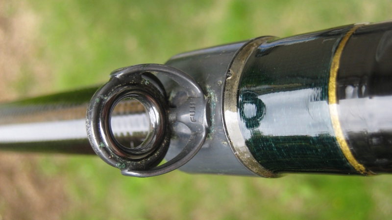 フロントグリップはスパイラル状のラバーで、ラバーの光沢が製造時期により差があって残念ですが、汚れが拭き取りやすいラバーです。ガイドリングはSiC(シリコンカーバイドファインセラミックス)で、長年の酷使にも耐えられます。全般的に作りの粗さが目につきますが、この竿に関してというよりも、おそらく当時の技術レベルの問題だと思います。しかし、性能品質に関しては高い水準であり、安心して使うことができます。