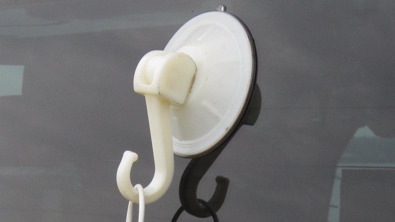 ガラスはもちろん、車のボディーにも強力に吸着できる吸盤フックです。ハンガーやランタンを掛けたりする時に使っていますが、元々は車から張るタープに付属していたフックです。これは非常に便利です。