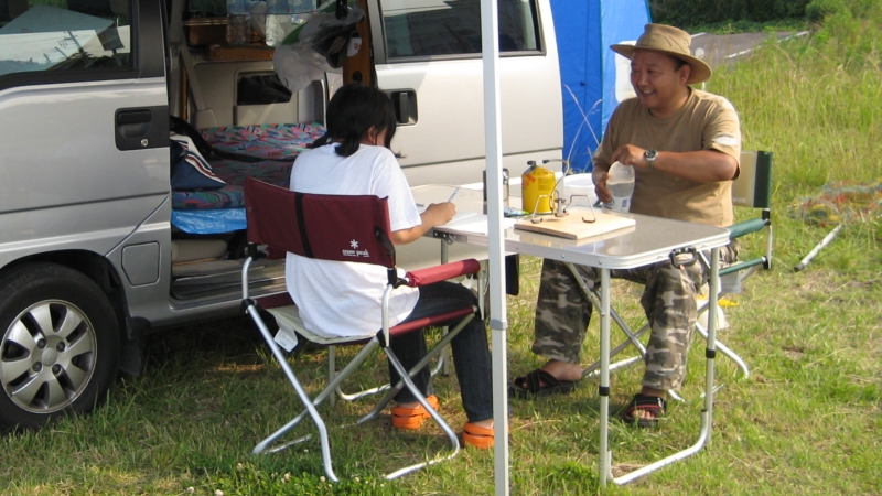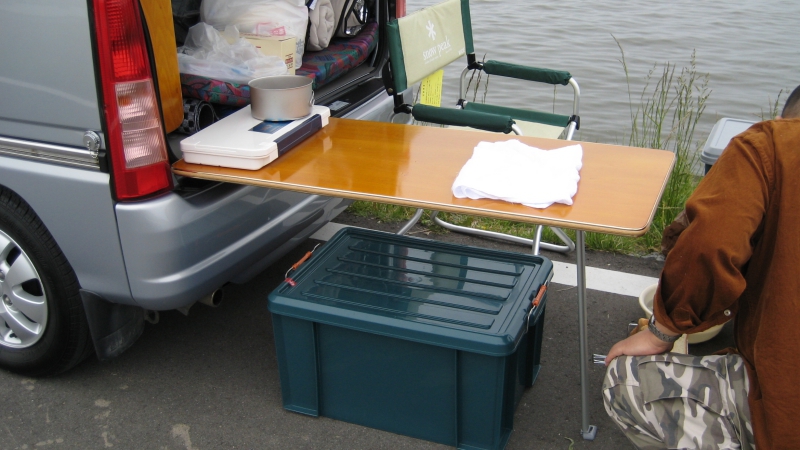 しっかりしたアルミ製折り畳みテーブルと椅子を使っています。写真は娘を連れて水郷に釣りに行った時のものです。車に付けているタープと合わせて使うと、ゆったりと過ごすことができてとても快適です。