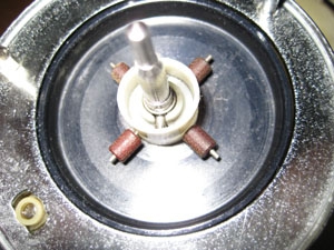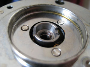 スプールキャップの内側には複数枚の真ちゅう製のベースワッシャがあり、これがスプールシャフトの端部に接触して摩擦力を発生します。接触面圧が高いためベースワッシャは摩耗しやすく、常にオイルを供給されていなければなりません。そのためにオイルを浸みこませるためのフェルトパッキンが入っています。これはベースワッシャとベアリング両方に給油する役目を果たしています。