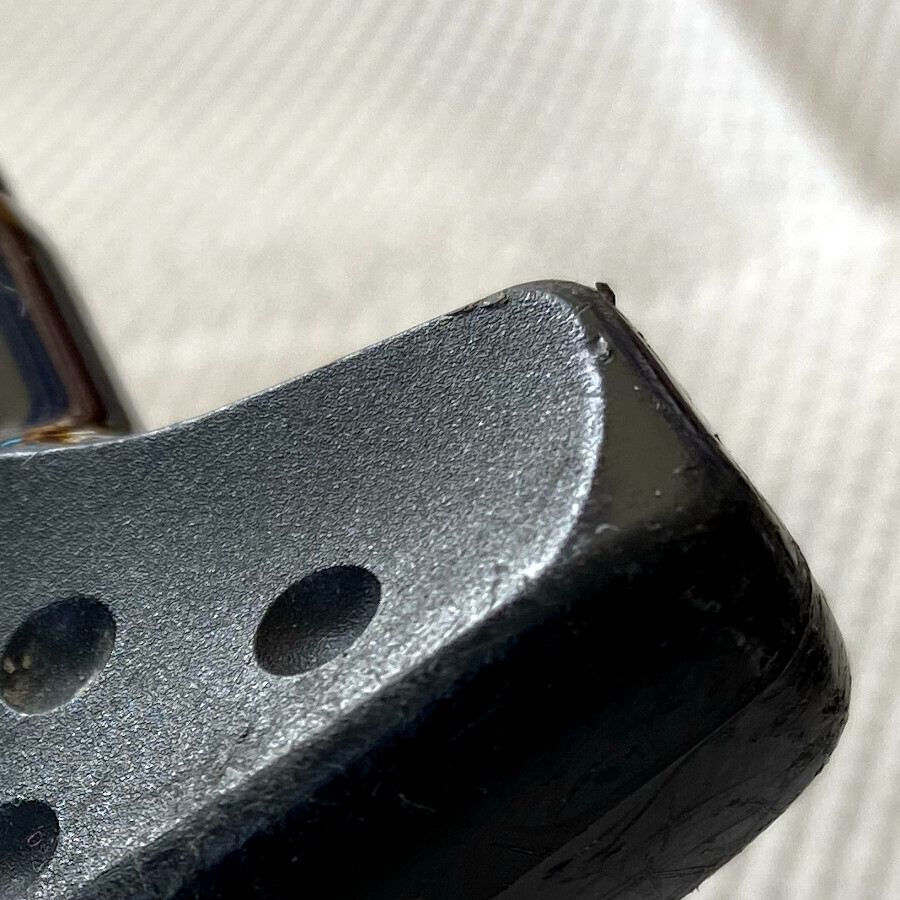 左サイドプレートをみると、3本あるはずのネジが2本しかありません(写真4)。ネジのないところをチェックすると、中に折れたネジが詰まっています。前のオーナーが締めすぎてネジを千切ってしまったようです。無理にいじるとダメージがありそうなので、ここもそっとしておくことにしました。