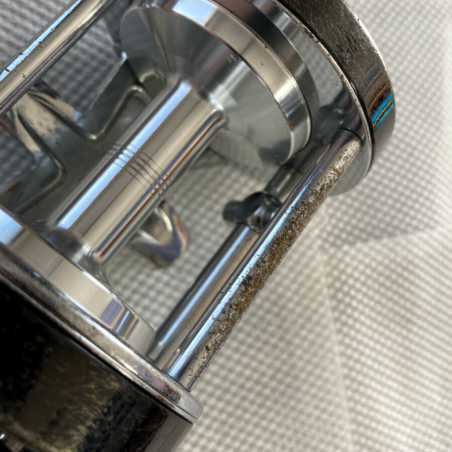 次は本体の腐食。特に目立つのはレベルワインダーの上のバーの部分。メッキがかなり剥がれて下地が腐食しています(写真3)。メッキの修復をうまくやる方法を考え付かなかったので、今回は錆落とし剤を使った後パーツクリーナーで洗浄して済ませました。