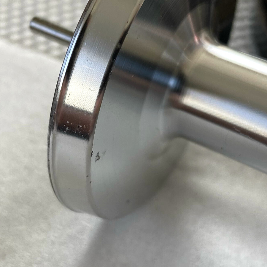 スプールをよく観察すると、内側のサイドに小さな黒い点が何箇所か見えます(写真5)。指で撫ででみるとざらつきが感じられました。おそらく腐食ではないかと思います。ラインにダメージがあるといけないので、ここも1000番のサンドペーパーで丁寧に磨き上げました。