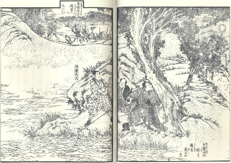 義実ははじめて景連の魂胆が読めたのでした。そしてこの乞食風の者は、実はかつて安房の滝田の城主に使えていた金碗八郎孝吉(かなまりはちろうたかよし)というものでした。淫婦の玉梓(たまずさ)の色香と酒に溺れ、政治は手がつけられな状態に陥ってしまった滝田に見切りを付けた孝吉は、里見義見とともに安房の国を平和に戻したいと迫りました。義実は暫く考えた末、一緒に旗揚げしていく決心をしたのでした。