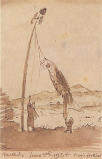 下の絵は、陶芸家バーナード・リーチが1934年に陶芸の町、栃木県益子町を初めて訪れた時に描いた端午の節句です。昭和初期の鯉のぼりを描いたこの作品では、回転球と矢羽根、そして鯉一匹となっています。この絵に添えられた文章を、以下に引用して紹介します。