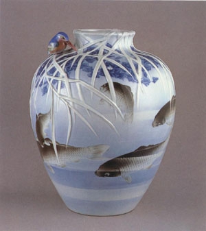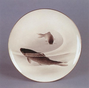 下の写真は伊万里焼(有田焼)で、製作はドイツ人のワグネルです。美しい鯉の姿に重なるように、透明感あふれる波紋が重なり、その重なり部分は光が屈折しているように絶妙な輪郭のズレと色彩の変化を見せています。もう一匹の鯉は奥から正面に向かって泳いでくる姿を描いています。この構成によりこの絵の奥行きがぐっと深みを増しています。鯉絵皿の傑作のひとつに数えられるでしょう。