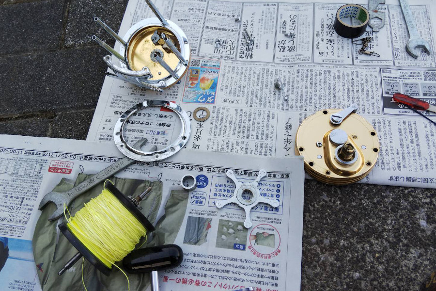 こぶ:ハンドルの回らないシーラインです。釣り場で分解は初めて!ネジが1ヶ所外れない・・・塩でベタベタ状態で中はひどいことに・・・回らない・・・
