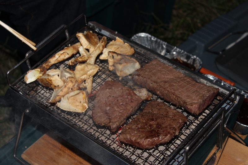 Afterward, as the evening approached without any bites, Chef Cob-chan started the barbecue. Matsutake mushrooms and beef were the first to grace the grill, followed by various ingredients that filled our bellies one after another. Barbecues are always enjoyable, no matter how old we get! After reminiscing about previous meetups and discussing our hopes for this one, Yasuko-san joyfully looked up at the starry night sky and spotted a constellation through binoculars. We spent a relaxed time late into the night. To wrap up the evening, we enjoyed yakisoba loaded with ingredients. Our stomachs and hearts were fully satisfied, and now we only had to wait for a big catch. The lake's surface had moderate ripples, and we could hear fish splashing here and there. We replaced one of the unnecessary transmitters with a device that allowed us to call each other in case of a bite during the night.