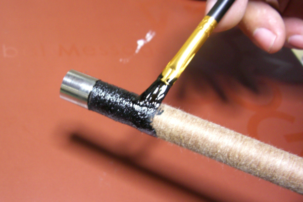 Apply Urushi lacquer. As mentioned in the previous chapter, use a brush in a vertical motion on the rod.