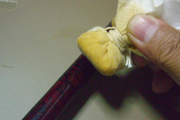 In the past, I tried wipe painting with Urushi directly on my hand, and it became excessively sticky, causing trouble. Since then, I have made a pad like the one shown in Photo 6, soaked it with Urushi, and used it for painting. Any fabric without lint should be suitable for the pad. I use old Japanese hand towels. The key points are to apply thin layers of Urushi, paint quickly and evenly, and prevent dust from settling during the drying process. This is the meticulous finish of the long-lasting painting process. Be careful, very careful!