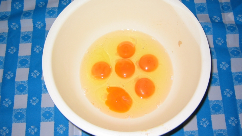 卵を割って良くかき混ぜます。その後、バニラエッセンスなどの香料を適量入れ、さらによくかき混ぜます。