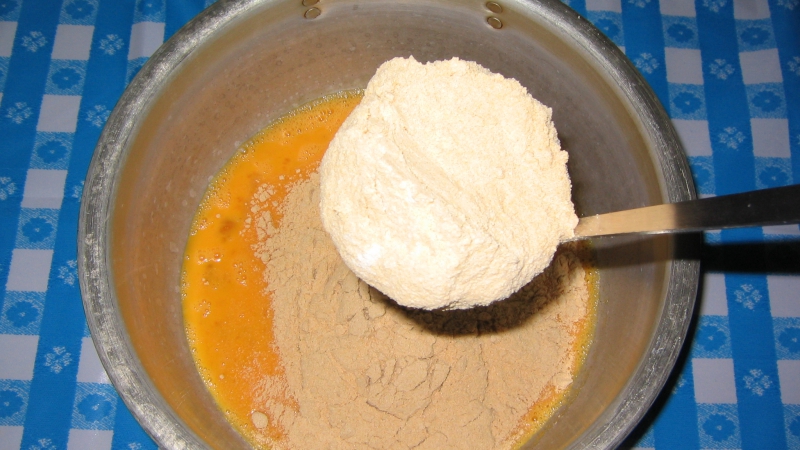 卵に配合済の粉を少しずつ入れます。決して一遍に入れずに、かき混ぜながらようすをみて少しずつ足していくと失敗しません。
