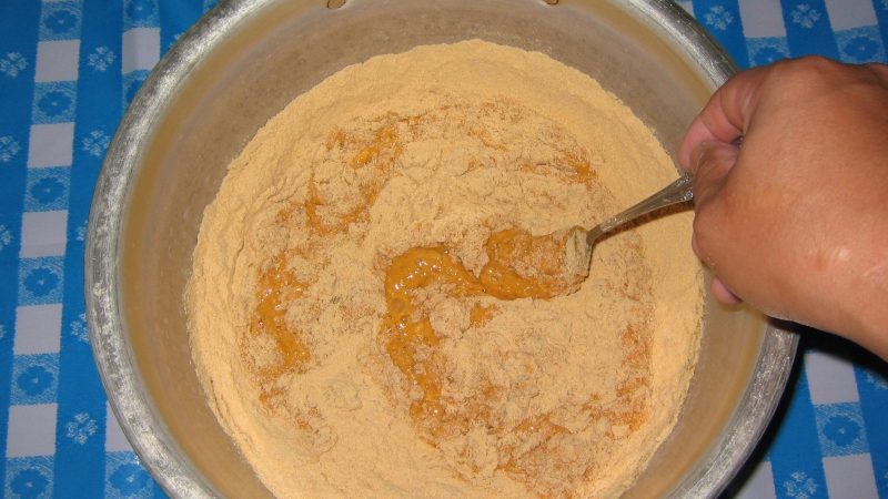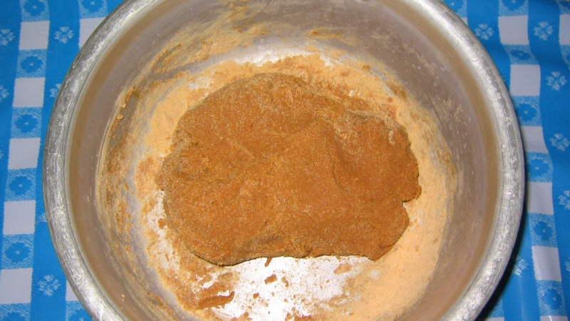 始めはスプーンやフォークを使って混ぜていきます。少し柔らかめの釣り餌程度になるまで粉を足して行ったら、こんどは手の平でよく練ります。